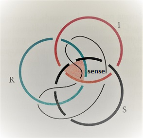 This is one of its multiple schemas. (There are the basic registers of human psychic life: the Real, the Imaginary, and the Symbolic, and the closed line labeled “sense,” which is like a sausage, is the sinthome, which binds them together in the case of artists, almost exclusively.)
